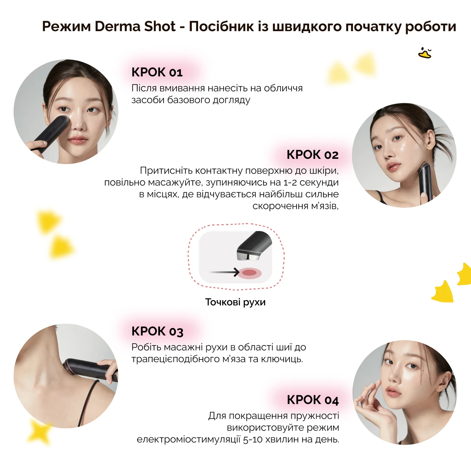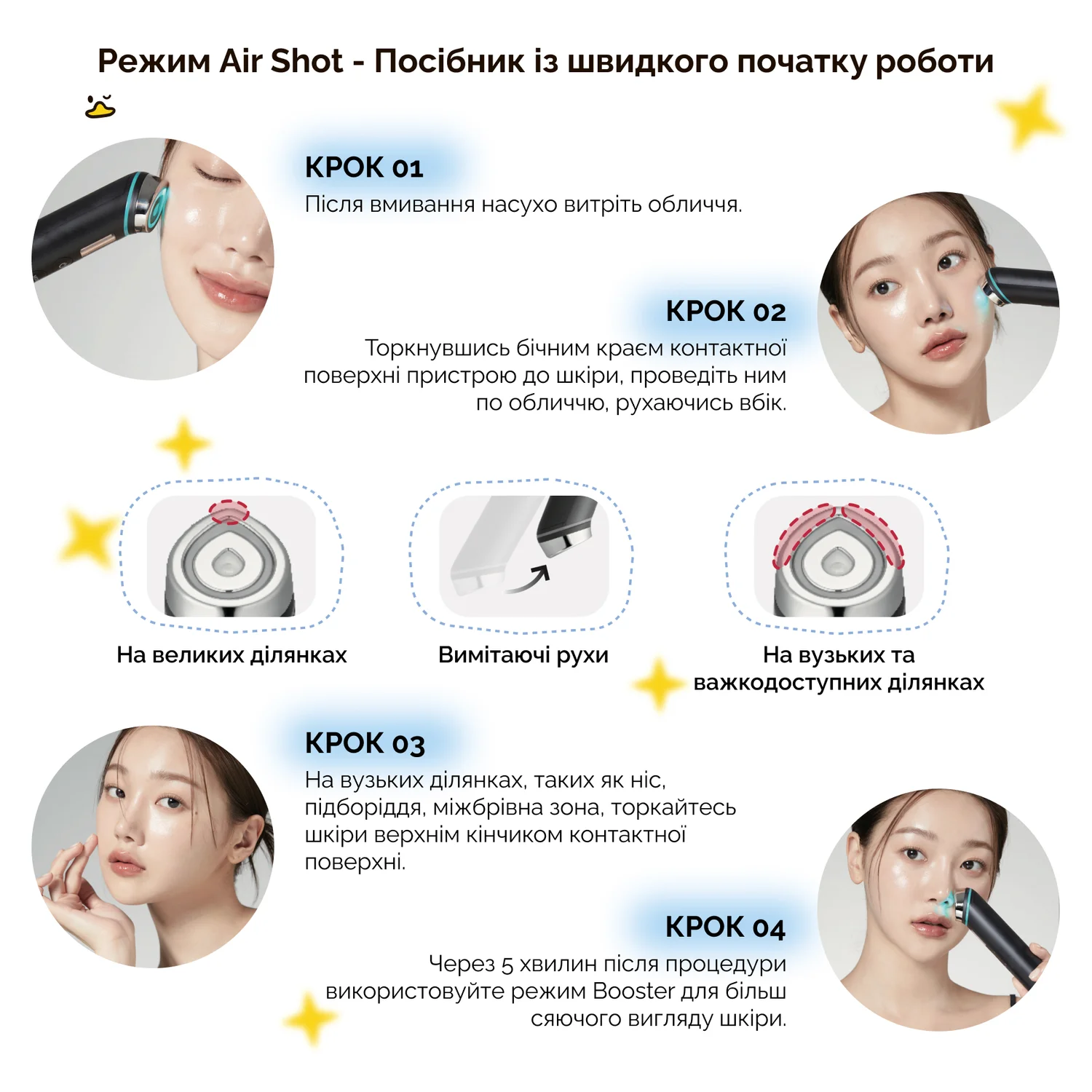 Рекомендована послідовність використання: Air Shot Mode → Booster Mode → MC Mode → Derma Shot Mode.