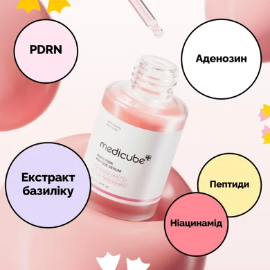 Medicube PDRN Pink Peptide Serum забезпечує багаторівневий догляд завдяки синергії активних компонентів. Полідезоксирибонуклеотид (PDRN) стимулює регенерацію клітин шкіри, покращуючи її текстуру та пружність. Комплекс пептидів підтримує природний синтез колагену, зменшуючи видимість тонких ліній та зморшок. Ніацинамід освітлює шкіру, вирівнює її тон і зменшує почервоніння. Аденозин має антивіковий ефект, сприяючи відновленню шкірного бар’єра.