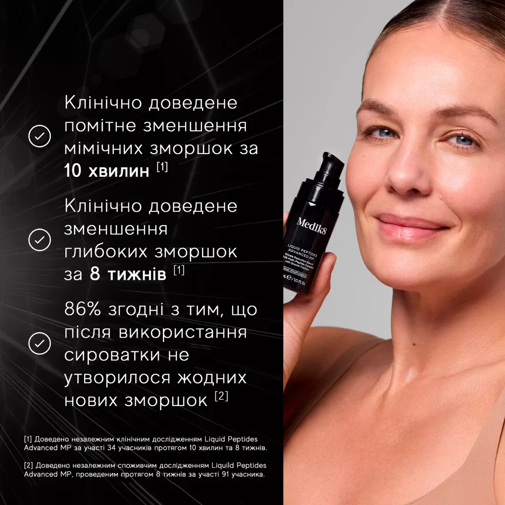 Клінічно доведено, що сироватка Liquid Peptides Advanced MP зменшує прояв мімічних зморшок за 10 хвилин та видимість глибоких зморшок за 8 тижнів.