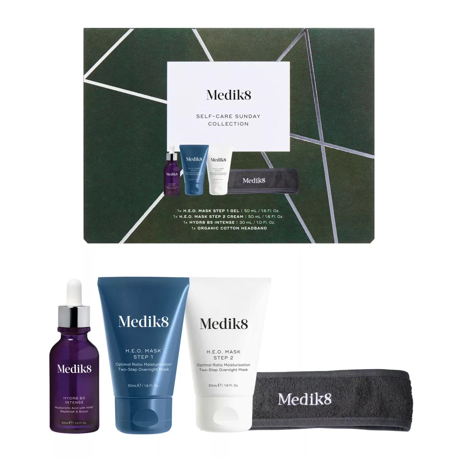 Тримайте волосся подалі від обличчя за допомогою суперм’якої пов’язки, коли наносите двоступеневу нічну маску H.E.O. Mask від Medik8, оптимізовану експертами для забезпечення 72 годин зволоження.* Посилюйте та підтримуйте результати зволоження та видимого розгладження шкіри обличчя за допомогою Hydr8 B5 Intense — зволожувальної сироватки від Medik8 з підвищеним вмістом вітамінів.