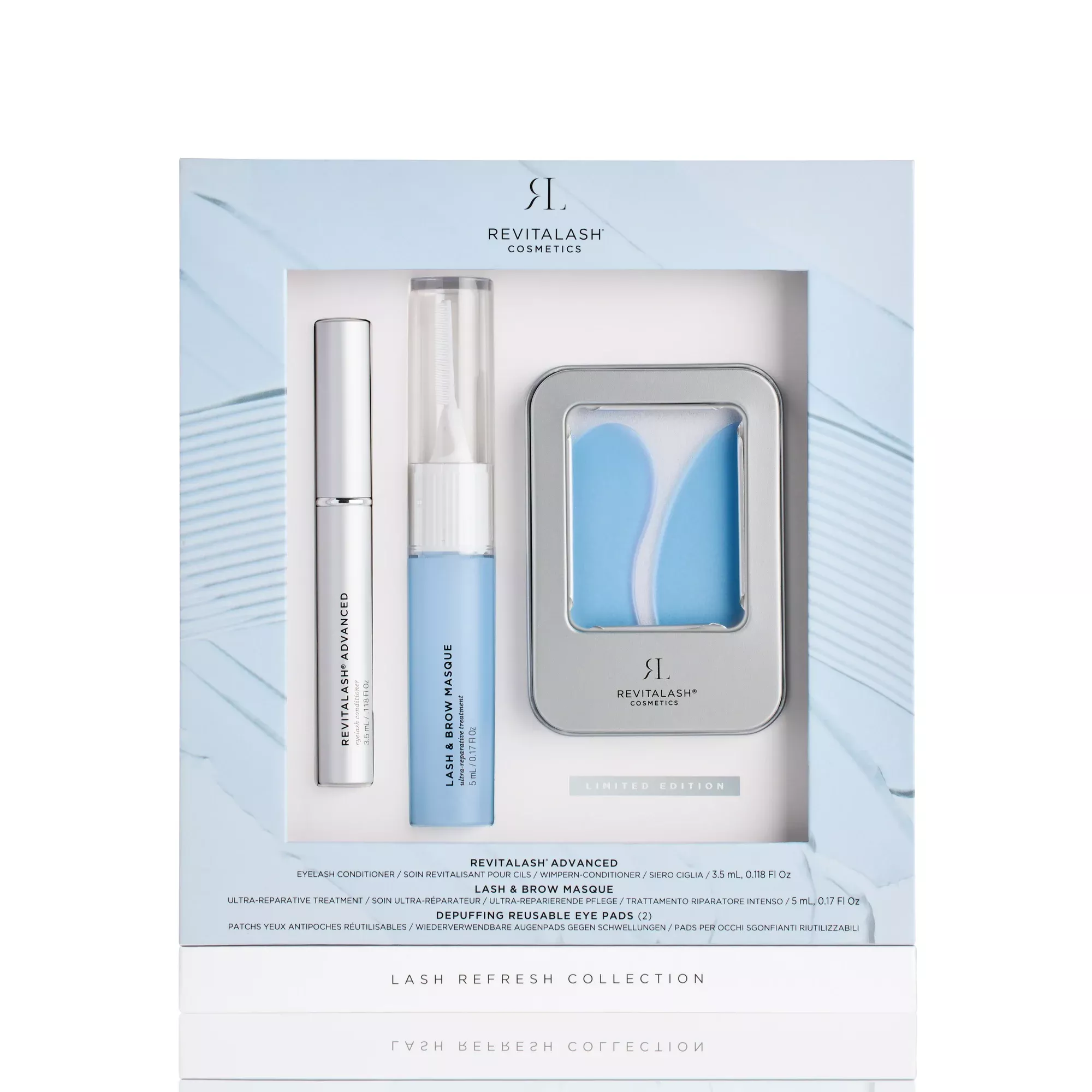 Лимитированный набор с двумя полноразмерными средствами — сывороткой для ресниц Revitalash® Advanced и увлажняющей маской для ресниц и бровей. Уникальность набора — многоразовые патчи под глаза, которые снимают отечность и успокаивают кожу вокруг глаз.